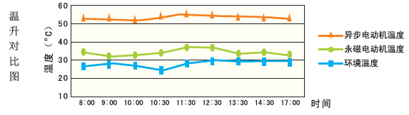 | 溫升低15~20℃ 與普通三相異步電動機相比,稀土永磁同步電動機的電阻損耗小,因此總損耗大大降低,同時也降低了電動機的溫升。經實測,在同等條件下,稀土永磁電動機的工作溫度比異步電動機低15~20℃,因此如果車間全部改造使用稀土永磁電動機,車間內的溫度將明顯降低,對改善夏季車間工作環境及節約空調用電有很大作用。